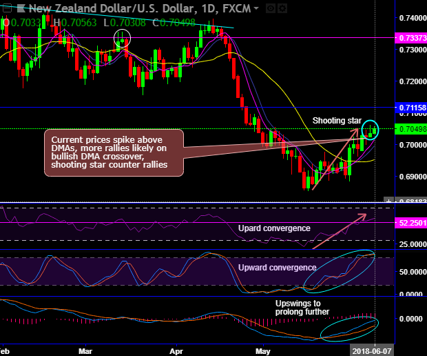 For now, despite prevailing rallies, shooting star pops at 0.7033 levels to counter-rallies, rallies likely to extend further on bullish DMA crossover and sustenance of bullish momentum.