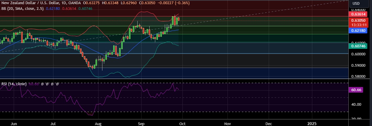 • Immediate resistance is located at 0.6350(23.6%fib), any close above will push the pair towards 0.6375(Higher BB).