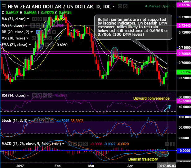 Although there has been bullish sentiment for the day, the ongoing rallies are unlikely to show stern moves above as we’ve traced out bearish DMA crossover, the next stiff resistance is seen at 0.6968 levels.