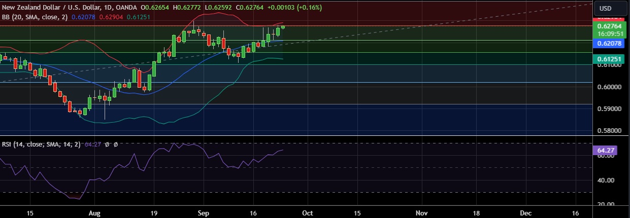 • Immediate resistance is located at 0.6278 (23.6%fib), any close above will push the pair towards 0.6291(Higher BB).
