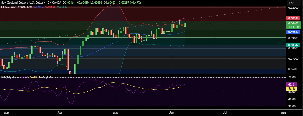 • Immediate resistance is located at 0.6069(23.6%fib), any close above will push the pair towards 0.6097 (Higher BB).
