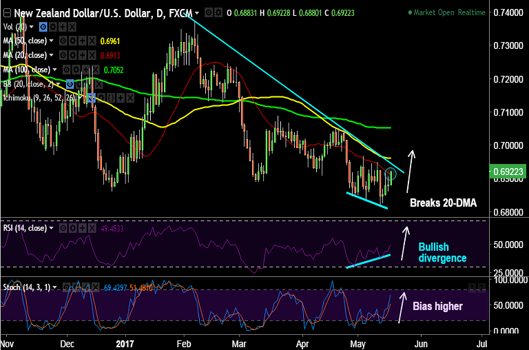 - NZD/USD closed above 20-DMA on Wednesday's trade, intraday bias higher.