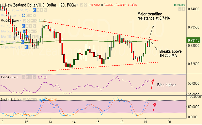 - The major finds stiff resistance at 0.7315 (trendline) on hourly charts, break above could target 0.7330 and then 0.7365 levels.