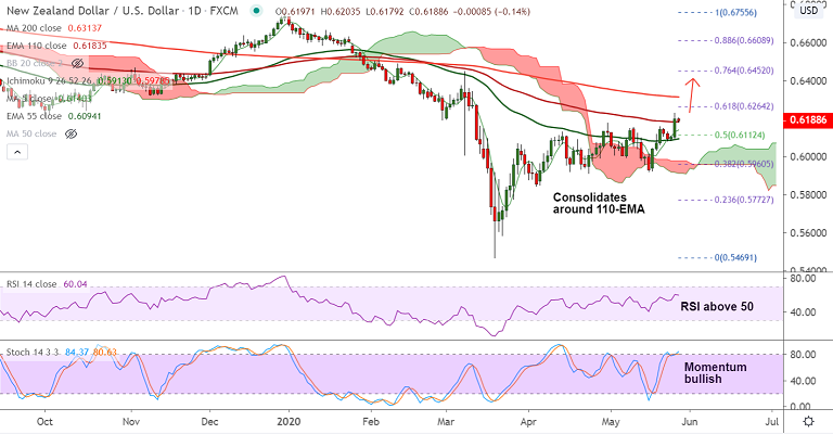 5-DMA is immediate support at 0.6140. Break below 55-EMA negates near-term bullish bias.