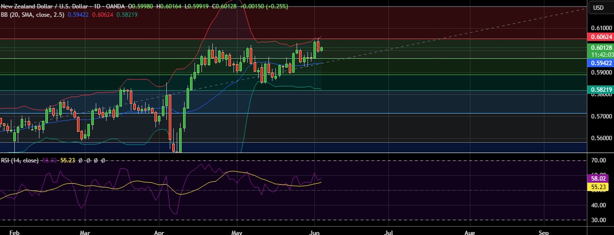 • Support is seen at 0.5965 (38.2%fib) and break below could take the pair towards 0.5889(50%fib).