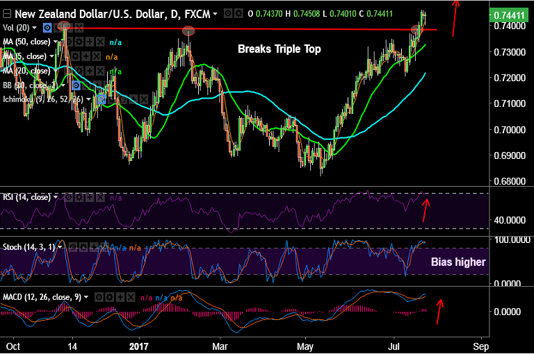 - NZD/USD is seen consolidating upside after break above 'Triple Top' on Friday last week.