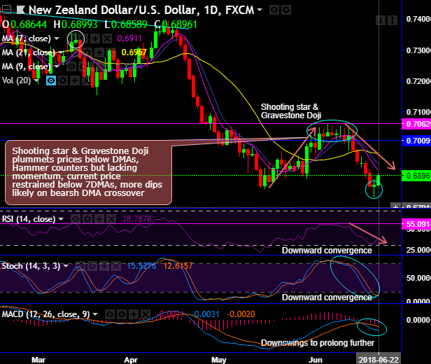 On daily plotting of NZDUSD, bulls bounce-back with hammer pattern candle at 0.6864 levels, we can observe steep slumps below DMAs soon after streaks of bearish patterns, such as hanging man, back-to-back shooting stars and gravestone doji patterns at peaks of rallies.