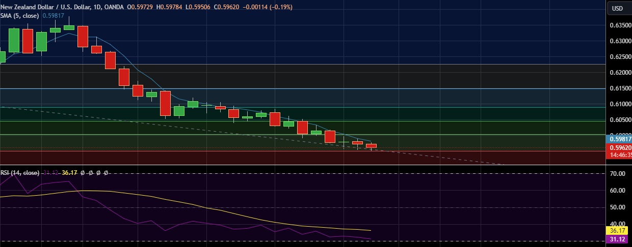 • Support is seen at 0.5949 (23.6%fib) and break below could take the pair towards 0.5915(Ag 6th low).