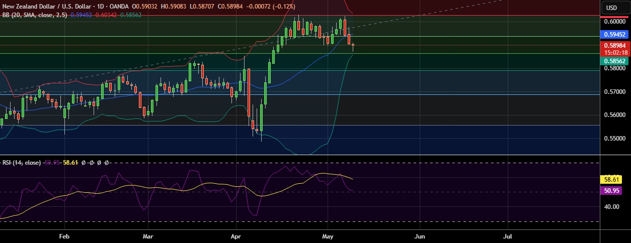 • Support is seen at 0.5863 (50%fib) and break below could take the pair towards 0.58180(April 14th low).