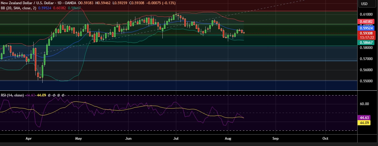 • Support is seen at 0.5915 (50%fib)and break below could take the pair towards 0.5869(Lower BB).
