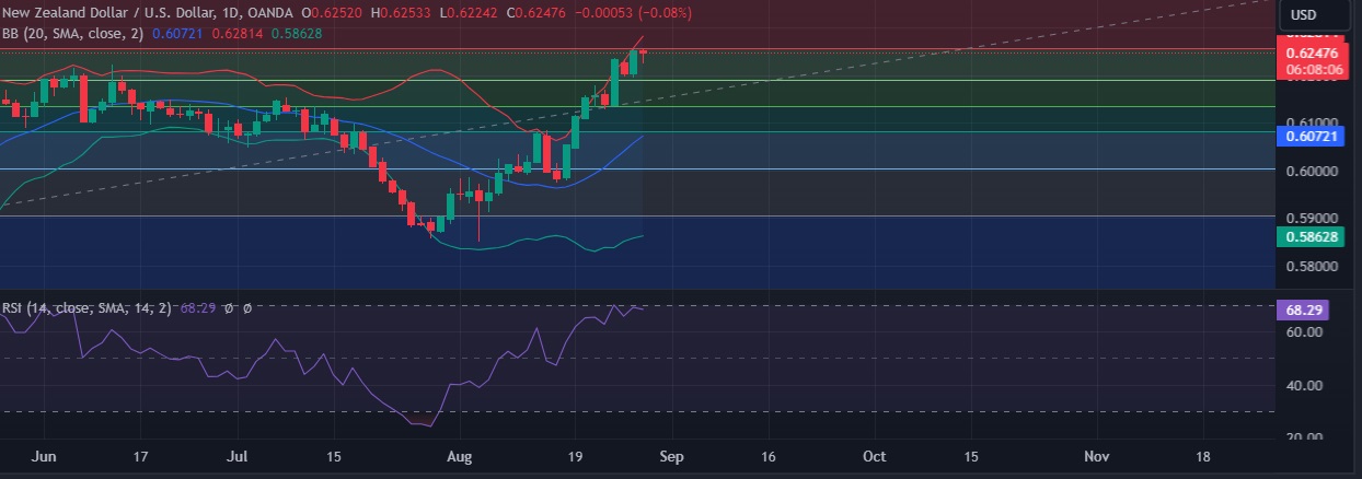 • Immediate resistance is located at 0.6256(23.6%fib), any close above will push the pair towards 0.6278 (Higher BB).