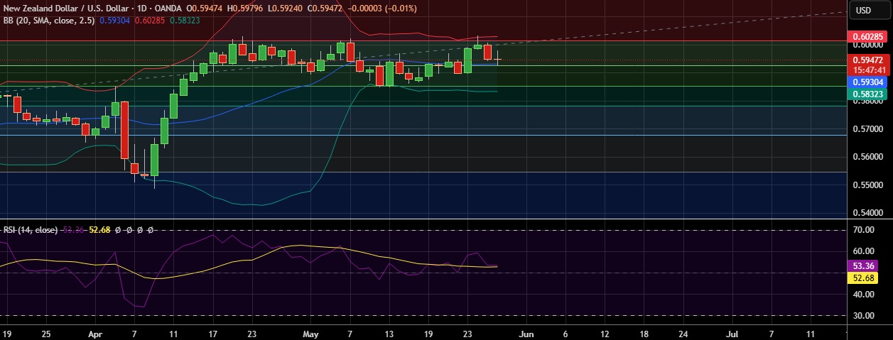• Support is seen at 0.5969(38.2%fib) and break below could take the pair towards 0.5891(50%fib).