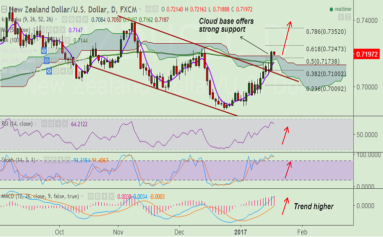 - Ichi cloud top at 0.7187 is strong support, break below could see some weakness upto 0.7174 (50% Fib).