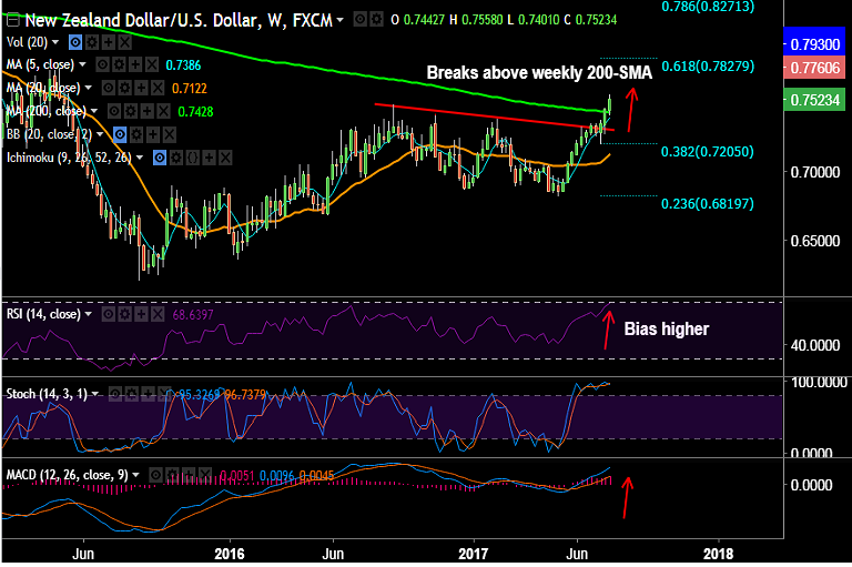 - NZD/USD spiked to hit fresh 2-year highs at 0.7558, bias still higher.