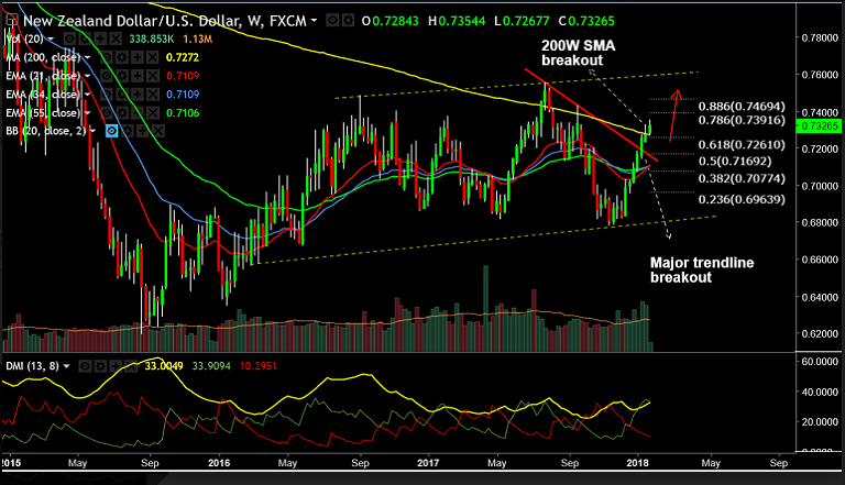 Support levels - 0.73 (5-DMA), 0.7272 (200W SMA), 0.7261 (61.8% Fib retrace of 0.7558 to 0.6780 fall), 0.72