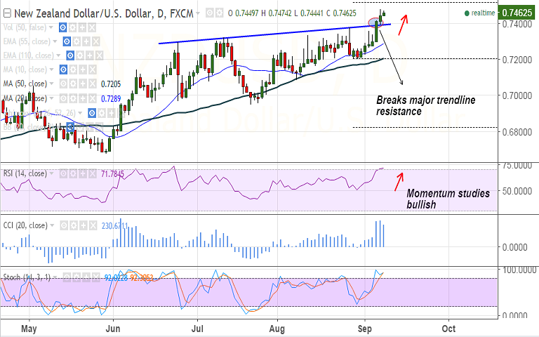- NZD/USD hit fresh highs at 0.7489 last seen since May 2015 on Wednesday's trade.