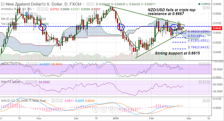 NZD/USD trades largely rangebound after rejection at 0.6667 which is strong triple top resistance (Nov 4th 2015, Jan 7th and Feb 18th 2016).