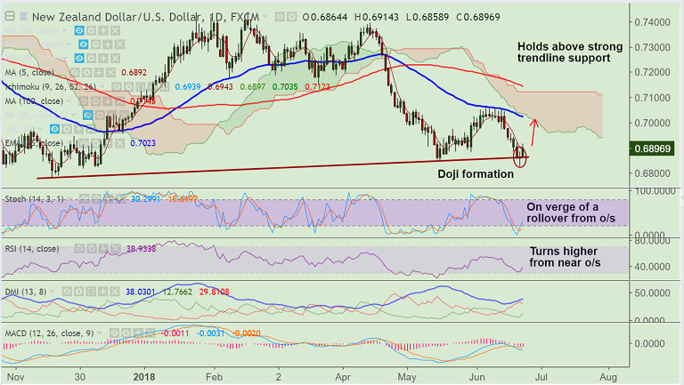 - NZD/USD fails to close below major trendline support at 0.6860, bounces of with a Doji formation.