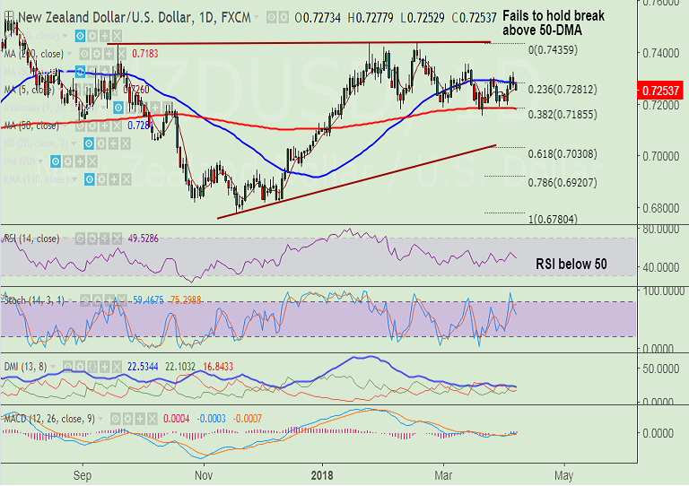 - NZD/USD is extending weakness for 2nd straight session after the major fails to hold break above 50-DMA.