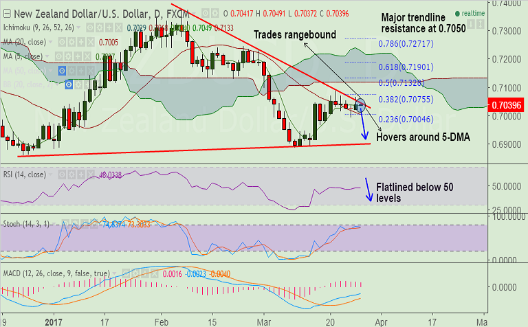Support levels - 0.7005 (20-DMA & 23.6% Fib of 0.6890 to 0.73756 rally), 0.6994 (Mar 23 low), 0.6945 (trendline)