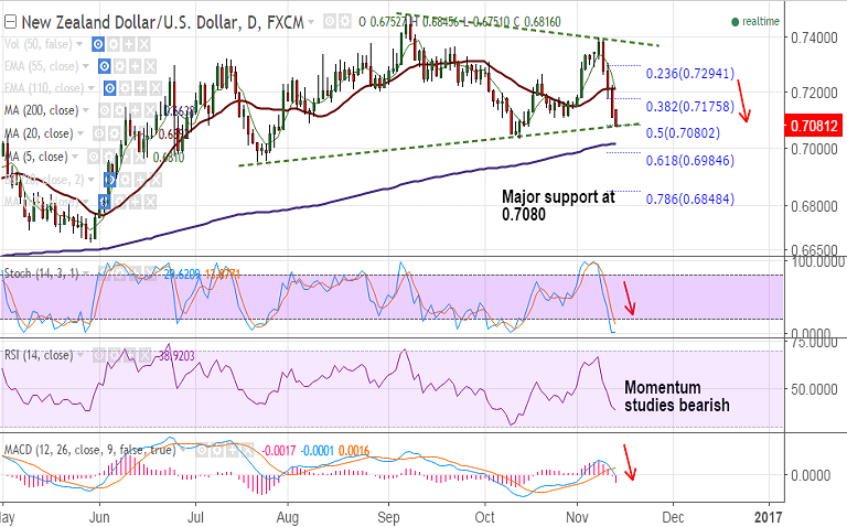 - The pair is holding above major support at 0.7080 levels, break below to see further downside.