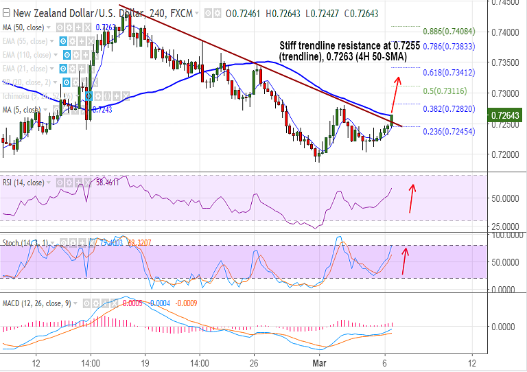 Resistance levels - 0.7255 (trendline), 0.7263 (4H 50-SMA), 0.73, 0.7341 (61.8% Fib retrace of 0.7437 to 0.7186 fall)