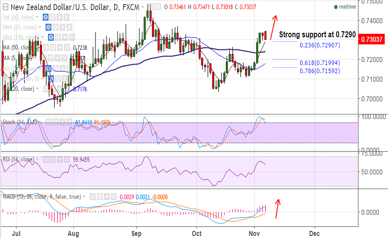 Recommendation: Good to go long on dips around 0.7290/0.73, SL: 0.7240, TP: 0.7345/ 0.7370/ 0.74