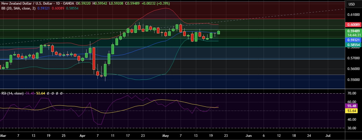 • Immediate resistance is located at 0.5960(38.2%fib), any close above will push the pair towards 0.6013 (Higher BB).
