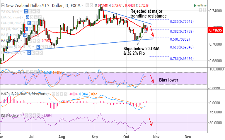- The pair is extending grind lower, has broken below major supports - 20-DMA (0.7186), 100-DMA (0.7184), 38.2% Fib (0.7175).
