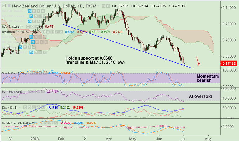 - Major trend remains bearish and close above 5-DMA at 0.6752 could see minor upside.
