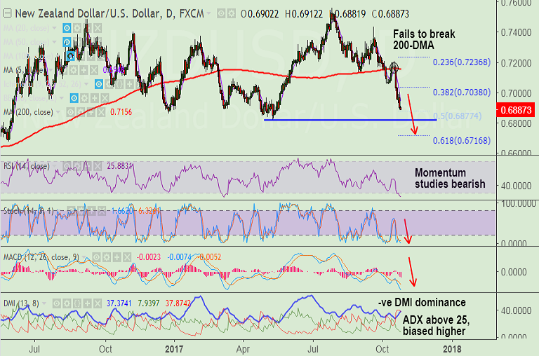 Resistance levels - 0.69, 0.6950 (5-DMA), 0.7038 (38.2% Fib)