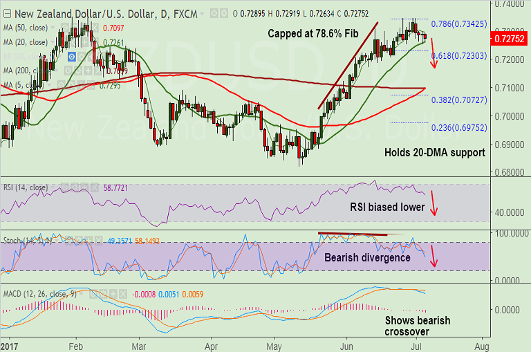 - The pair capped below 0.73 handle and 5-DMA at 0.7295 is immediate resistance on the upside.