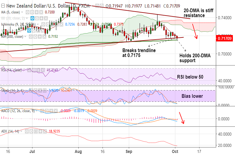 - The major finds strong support by 200-DMA at 0.7152, we see further weakness on break below.