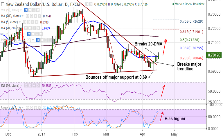 - NZD/USD has managed to break 20-DMA resistance at 0.6999 and is holding above the 0.70 handle.