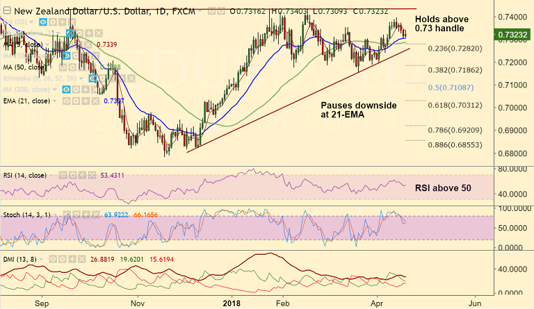 - NZD/USD holds above 0.73 handle, we see further weakness only on break below.