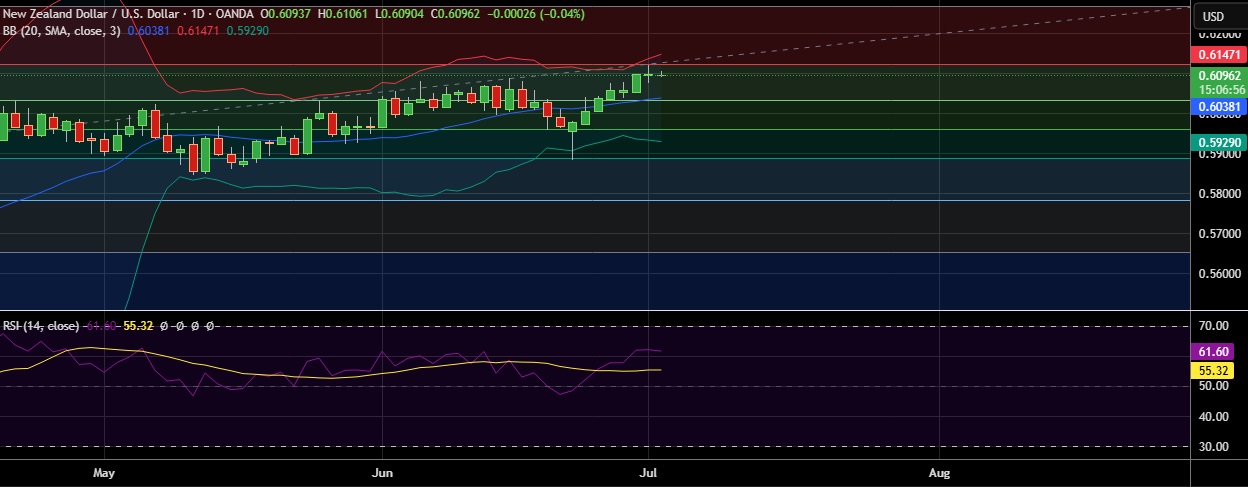 • Immediate resistance is located at 0.6120(23.6%fib), any close above will push the pair towards 0.6143(Higher BB).