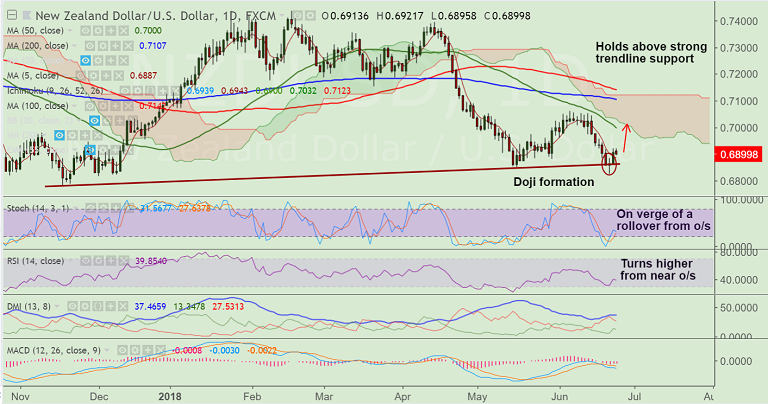 - Price action remains below daily cloud and major moving averages, break below major trendline support at 0.6870 could see further weakness.
