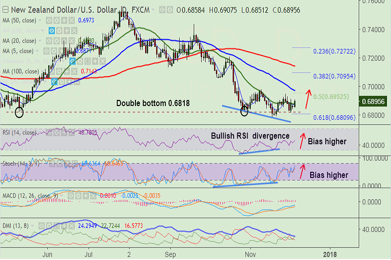 - NZD/USD up 0.55% on the day, breaks 20-DMA resistance at 0.6880, bullish divergence on RSI and Stochs keeps scope for upside.