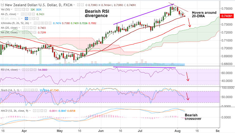 Support levels - 0.7388 (20-DMA), 0.7333 (July 20 low), 0.73, 0.7284 (50-DMA)