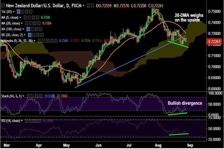 - NZD/USD hovers around 5-DMA at 0.7230, slips lower from session highs at 0.7257