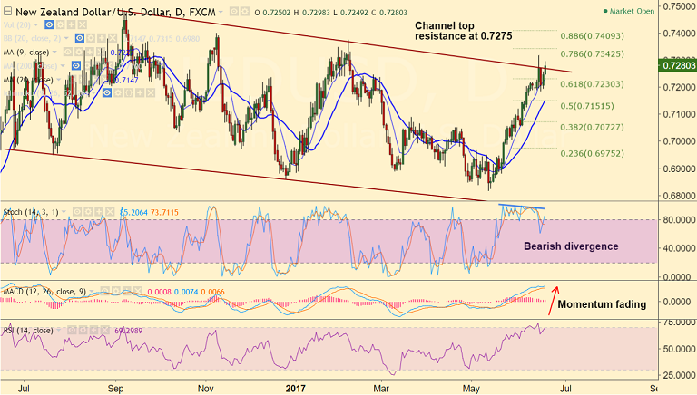 - The pair has edged lower from session highs and is hovering around channel top at 0.7275, only decisive break above could see further gains.