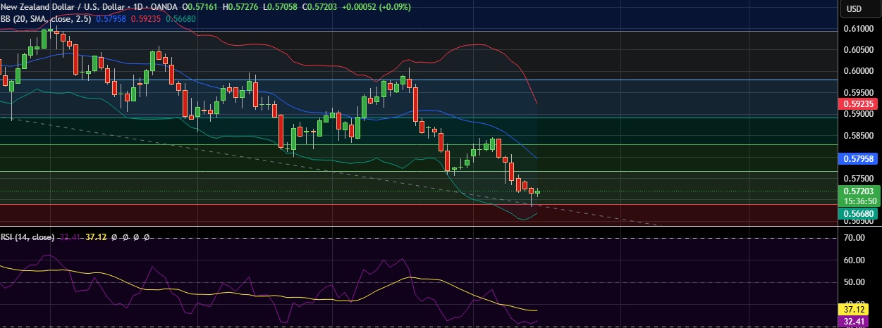 • Support is seen at 0.5689(23.6%fib) and break below could take the pair towards 0.5669(Lower BB).