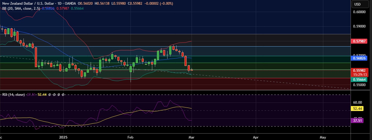 • Support is seen at 0.5566(Lower BB) and break below could take the pair towards 0.5544(23.6%fib).