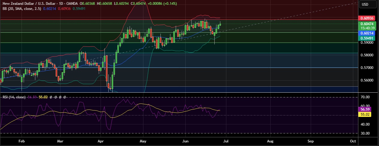 • Immediate resistance is located at 0.6079(23.6%fib), any close above will push the pair towards 0.6095(Higher BB).