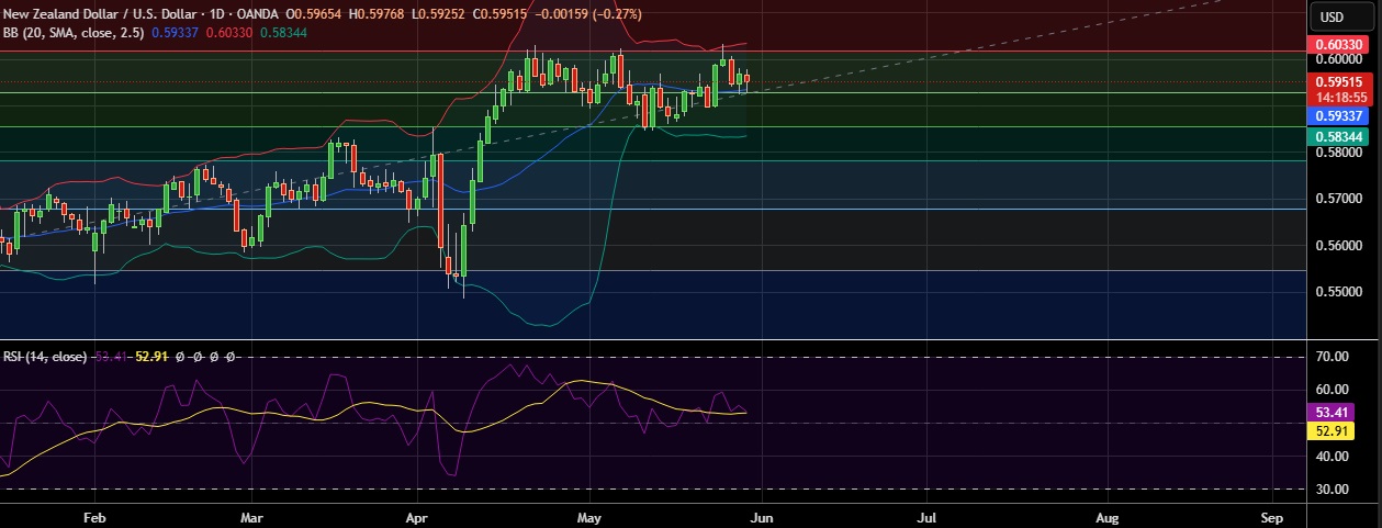 • Support is seen at 0.5928(38.2%fib) and break below could take the pair towards 0.5898(May 23rd low).