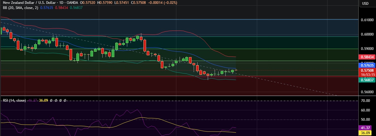 • Support is seen at 0.5710(23.6%fib) and break below could take the pair towards 0.5688(Lower BB).