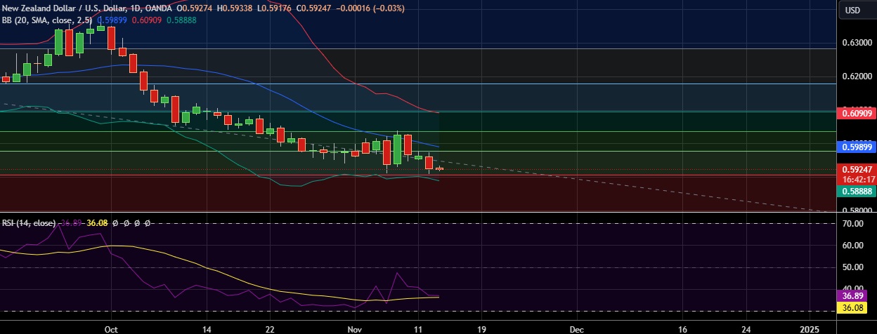 • Support is seen at 0.5910 (23.6%fib) and break below could take the pair towards 0.5891 (Lower BB).