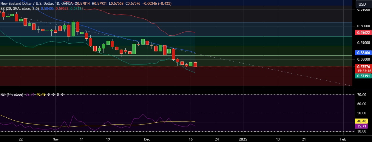 • Support is seen at 0.5755 (23.6%fib) and break below could take the pair towards 0.5715(Lower BB).
