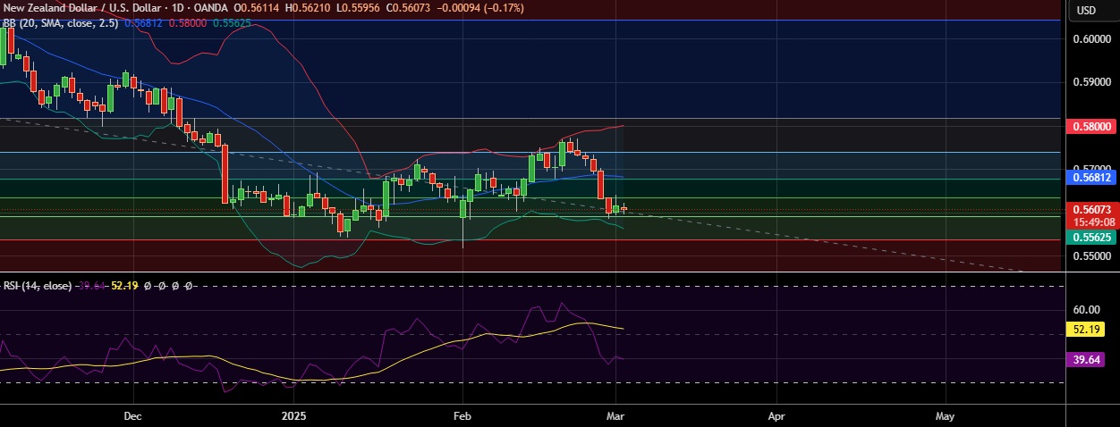 • Support is seen at 0.5591 (38.2%fib) and break below could take the pair towards 0.5562(Lower BB).