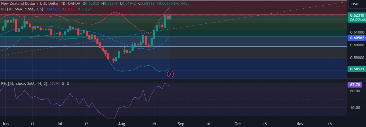• Immediate resistance is located at 0.6237(23.6%fib), any close above will push the pair towards 0.6267 (Higher BB).
